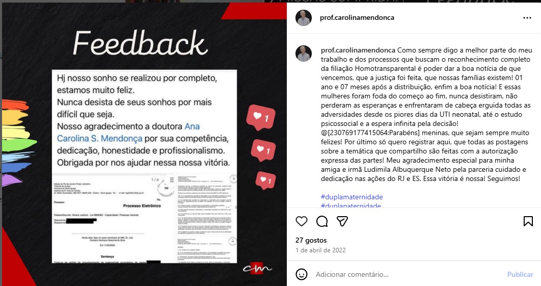 - Mais de 250 Processos patrocinados envolvendo a temática do Direito das Famílias e das Famílias LGBT.